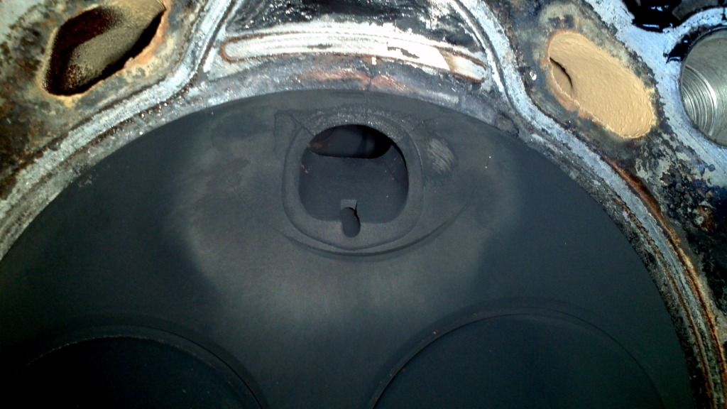 So some piston heads look ok, some look covered in carbon, and 6 has what looks like the corners chipped or bevelled off and the pattern on top not the same. Injector port 6 is pretty melted and exhaust (I think) valve with a nice crack going from outside edge to almost the middle of the valve. So I rekon this might be the problem. And also visible signs of leakage between 5 and 6. Looks like little score marks from something trying to breech the gasket.